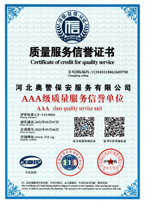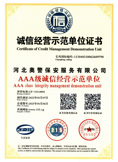 “忠誠(chéng)的伙伴,非凡的朋友”,河北奧警保安服務(wù)有限公司本著“客戶(hù)的需求就是我們的追求”的服務(wù)理念,與廣大客戶(hù)攜手并進(jìn)、共創(chuàng)恢弘偉業(yè)。